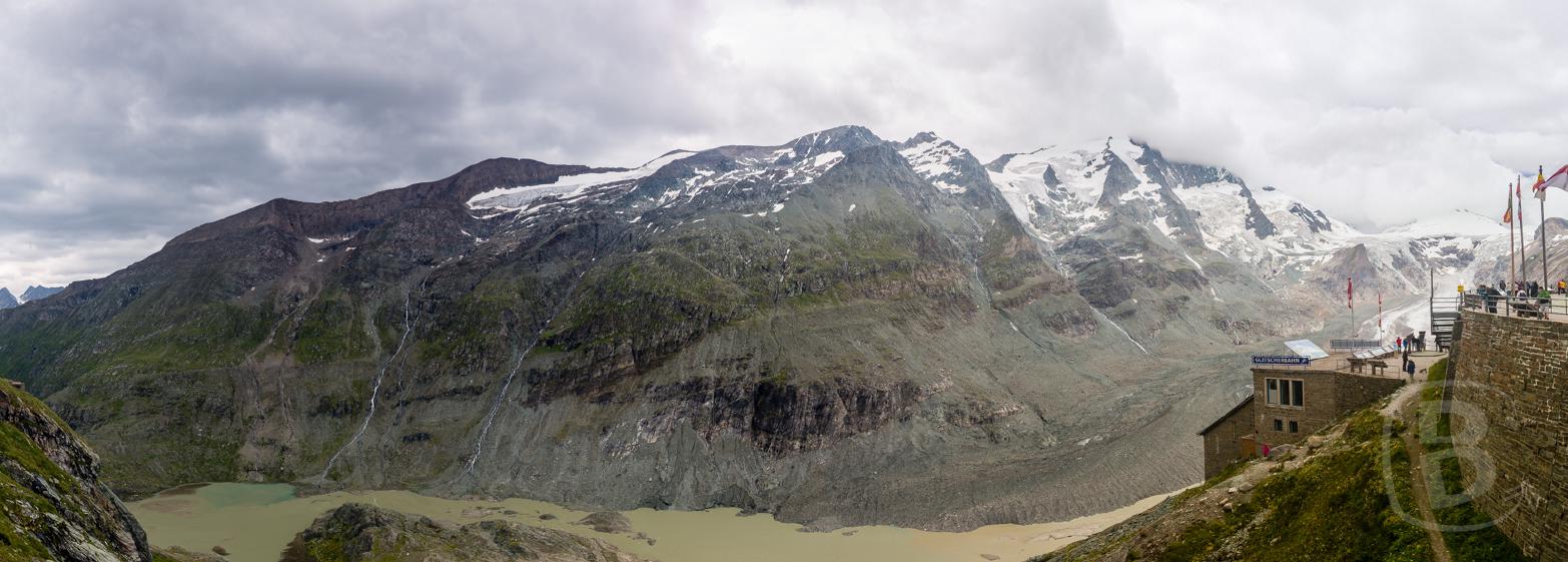 Drei Kilometer nach der Mautstation mache ich die ersten Fotos. Von diesem Punkt können wir die Dreitausender Berge bestaunen: Hohe Dock, Vorderer Bratschenkopf, Hoher Tenn und noch viele weitere Gipfel. Ich mache eine Panoramaaufnahme der Gipfel, das Wetter meint es inzwischen gut mit uns.