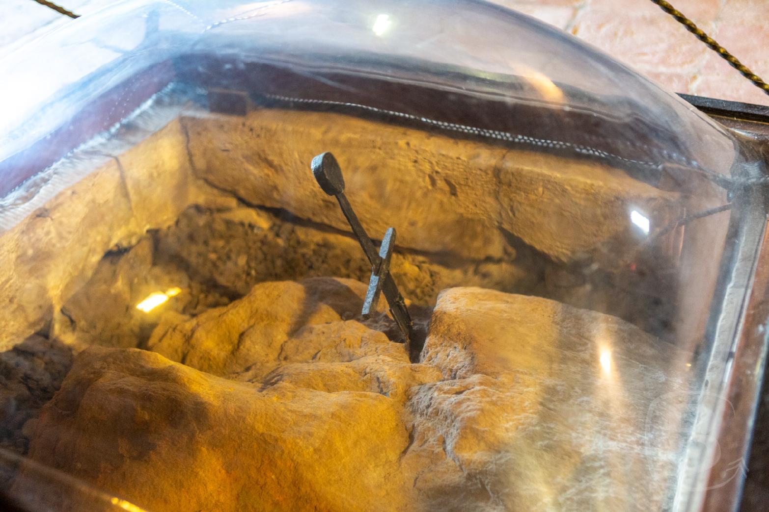 Im Nachbarraum befinden sich noch zwei alte Unterarme von einem Frevler unter Glas. Die Geschichte dazu: Er wollte das Schwert aus dem Stein ziehen. Ein von Gott gesandeter Wolf hat ihm darauf hin seine beiden Unterarme abgebissen. Die sind jetzt hier ausgestellt. Auf ein Bild verzichten wir.