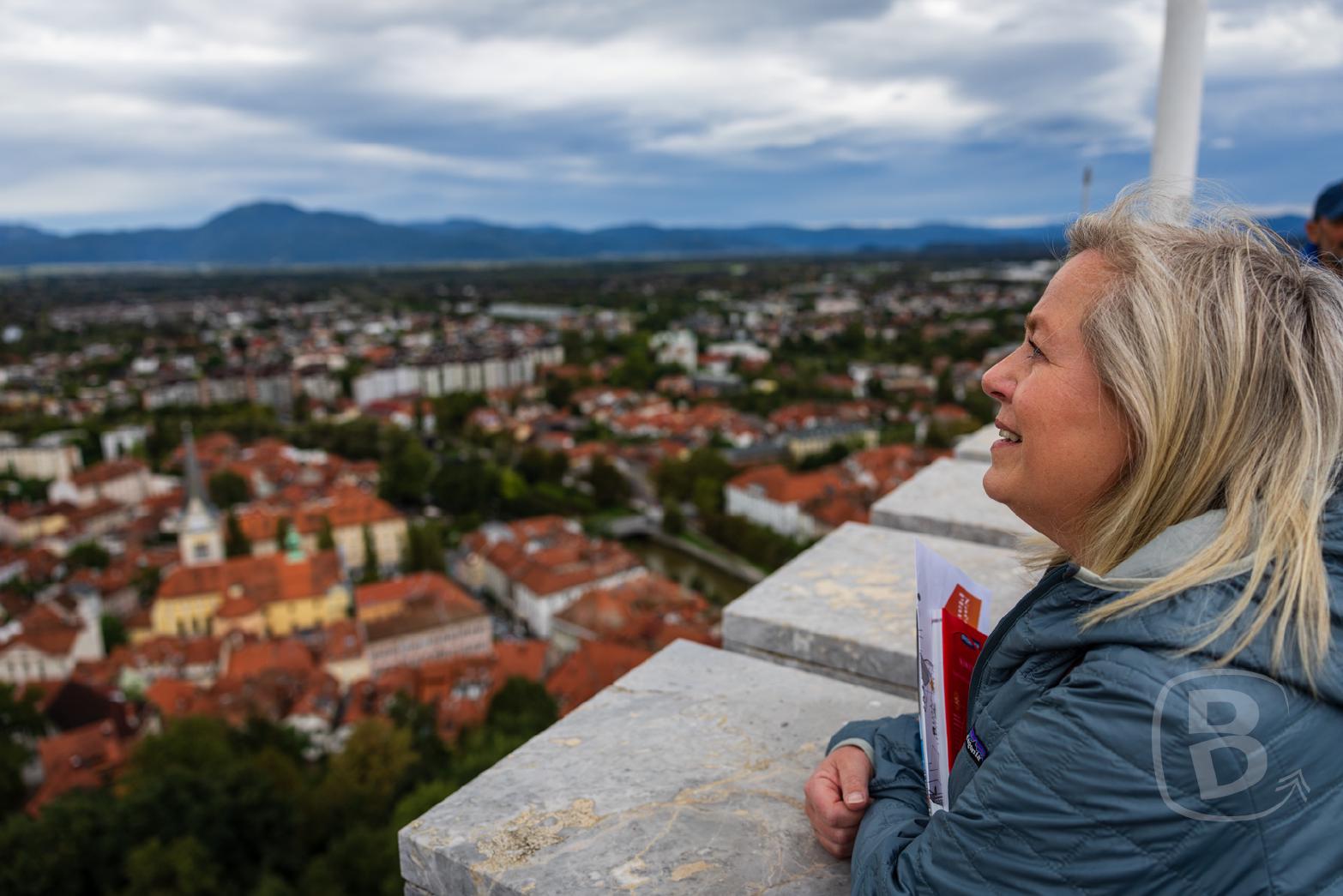 Von hier gehen wir zum Aussichtspunkt. Zur einen Seite erstreckt sich die tolle Aussicht auf Ljubljana zur anderen blicken wir direkt über den Burgplatz auf den Aussichtsturm.