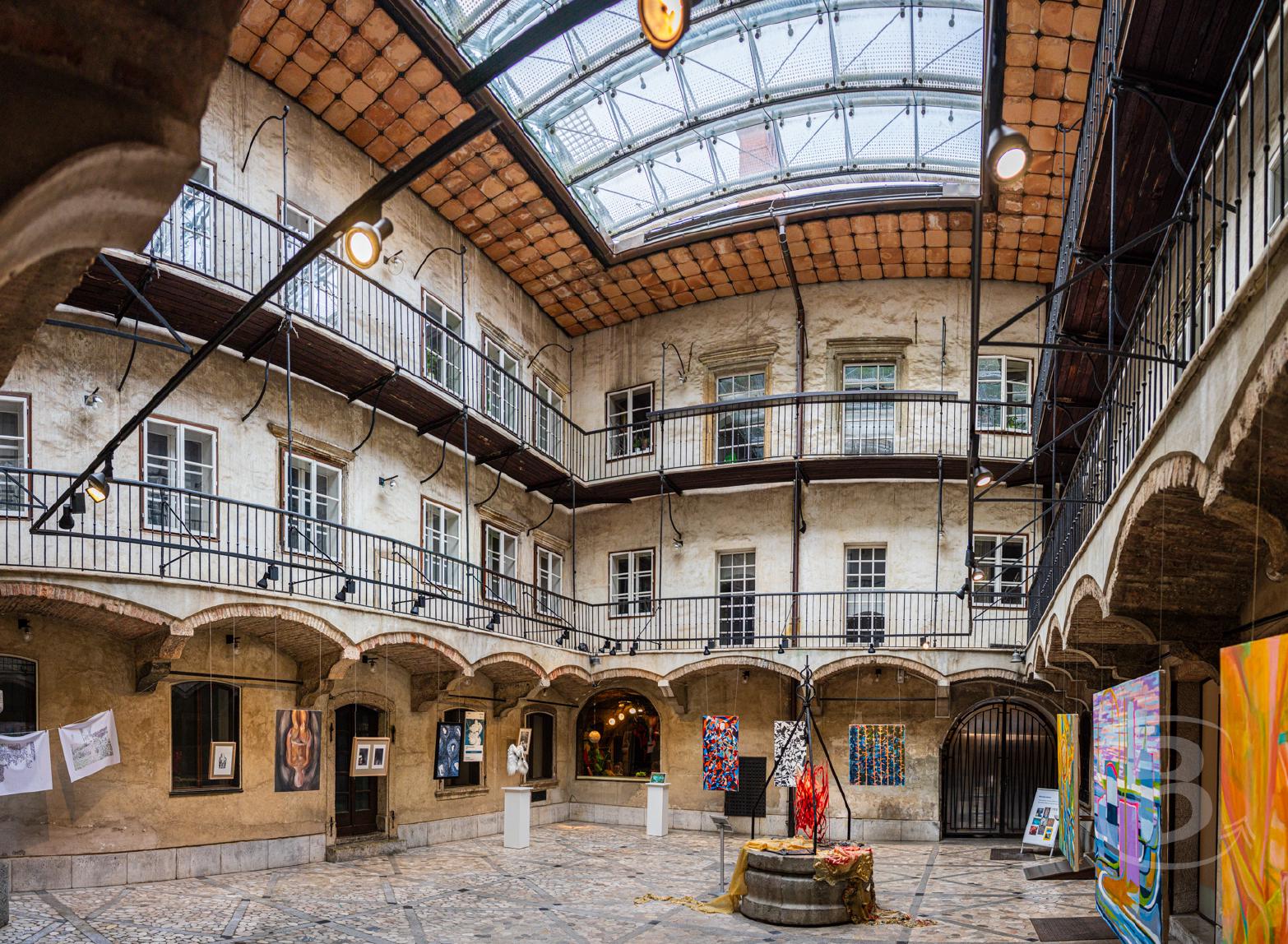 Wir gehen in den Innenhof des Rathauses. Diesen Eingang haben wir gestern gar nicht gesehen. Hier findet gerade eine Kunstausstellung statt.