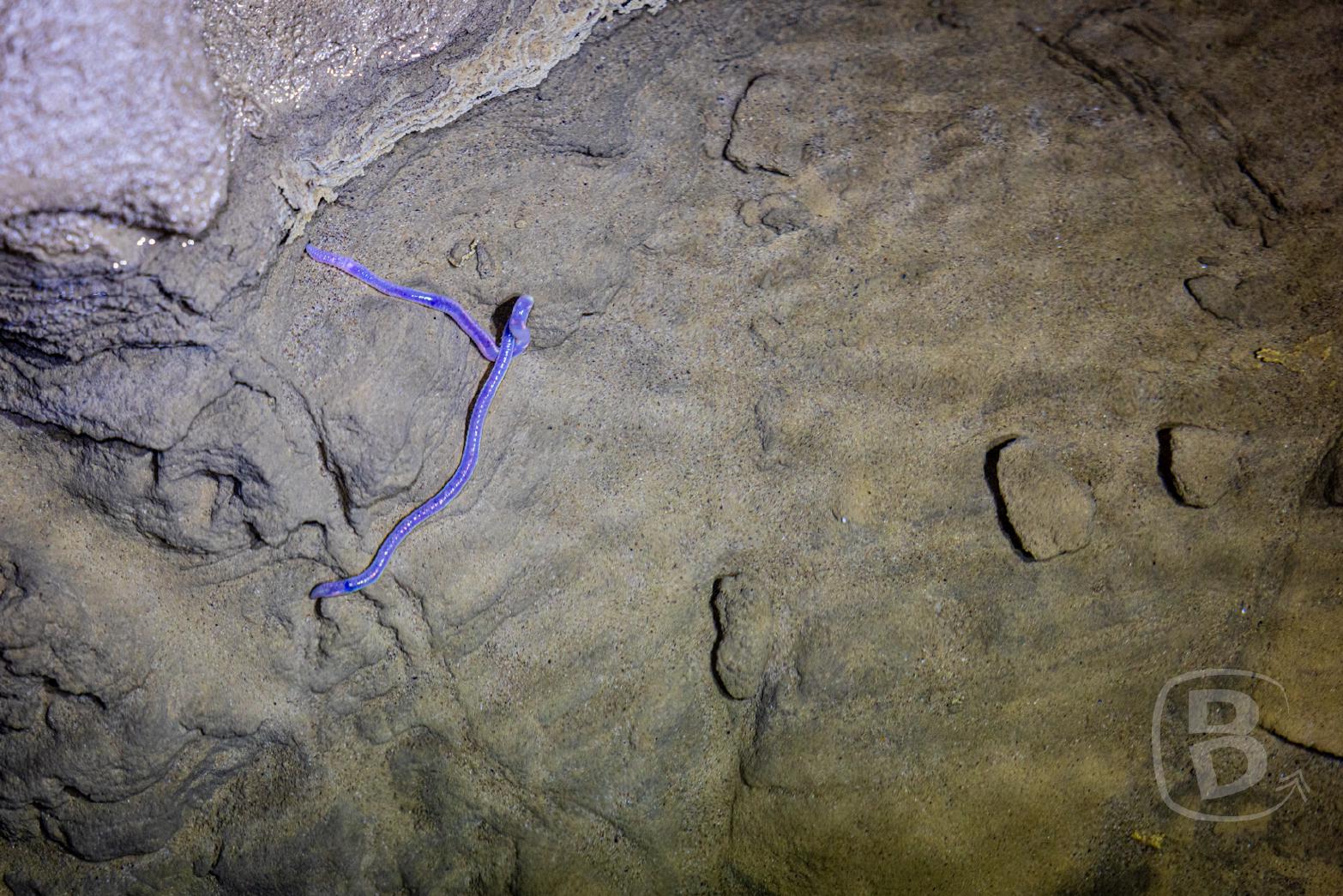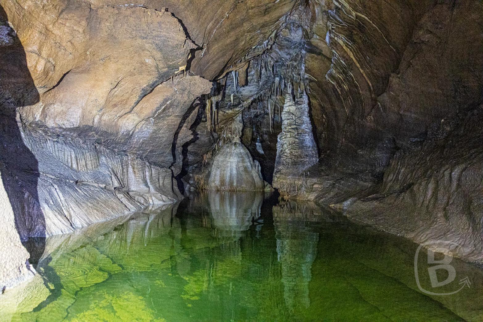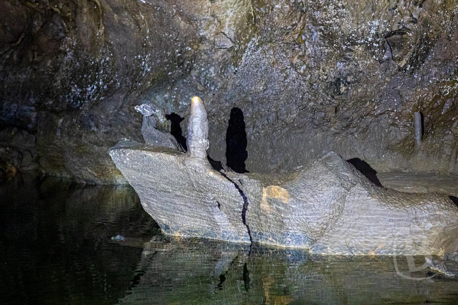 Dann kommt wieder eine Gehpassage, das einzige Licht sind jetzt noch unsere Stirnlampen. Die Durchfahrt am nächsten See ist so niedrig, dass sogar ich den Kopf einziehen muss. Es folgen wieder einige knifflige Gehpassagen, die sich mit weiteren Bootsfahrten abwechseln. Wir dringen immer weiter in die Höhle vor und sehen diverse tolle Tropfsteine. Luka erklärt und weist uns auf besondere Formationen hin, ist schon ziemlich toll. Langsam bin ich auch etwas ruhiger, scheint ziemlich sicher zu sein. An einer Stelle fordert uns der Guide auf, die Lampen auszuschalten. Es ist stockdunkel. Zwischen geschlossenen und geöffneten Augen ist kein Unterschied zu erkennen. Dazu ist es still, ganz gelegentlich ist ein Tropfen zu hören. Ziemlich unvergesslich.