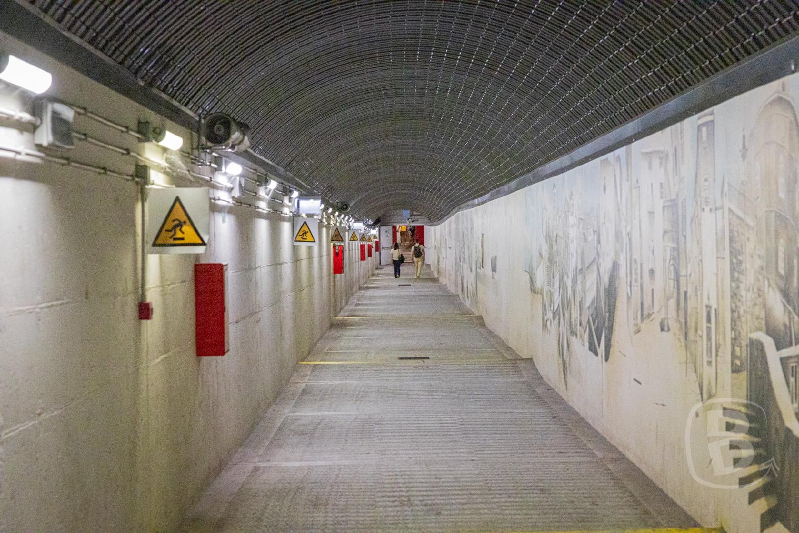 Jetzt geht es weiter zum römischen Forum (Foro Romano). Dies liegt auf einem Hügel. Diesen können wir erklimmen oder wir nehmen den Aufzug der 2015 erbauten Tiefgarage unter dem San-Giusto-Hügel, was wir natürlich tun. Am Ende des 100 Meter langen Hauptkorridors befindet sich der Fahrstuhl. Hier haben wir uns reichlich Stufen ersparrt.