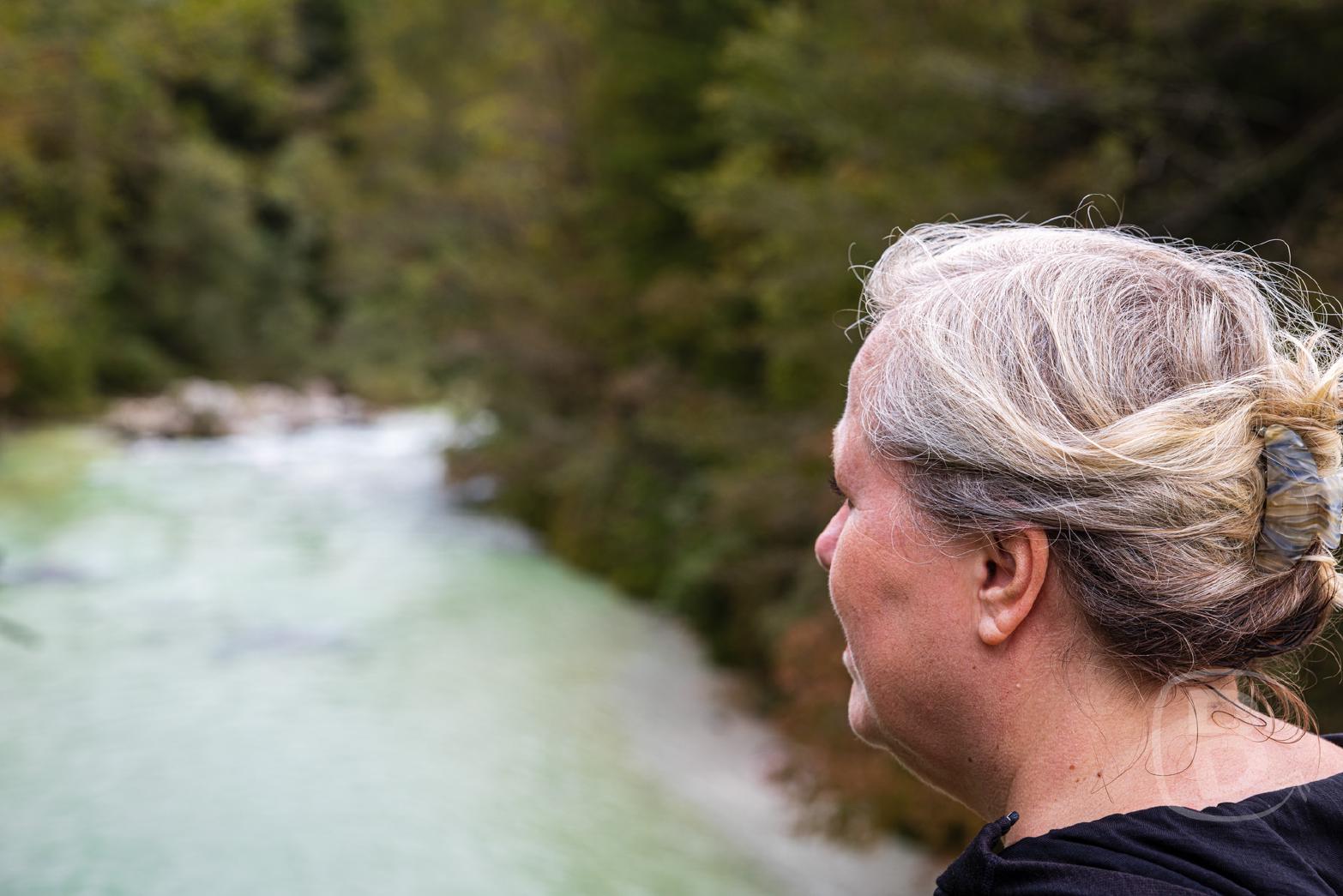 Von hier geht der Weg die ganze Zeit an der Soča entlang. Immer wieder zeigt sich uns der Berg Svinjak ohne Wolken.