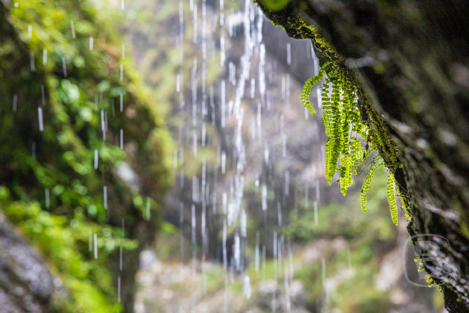 Wir laufen weiter und spannen unseren Regeschutz über die Rucksäcke. Der starke Regen ist jetzt noch stärker geworden. Wir laufen auf der anderen Seite durch einen Tunnel bis zum Ende der Klamm.