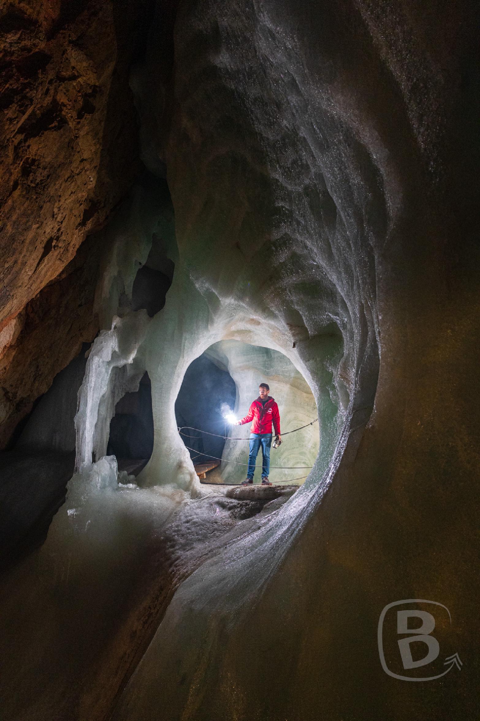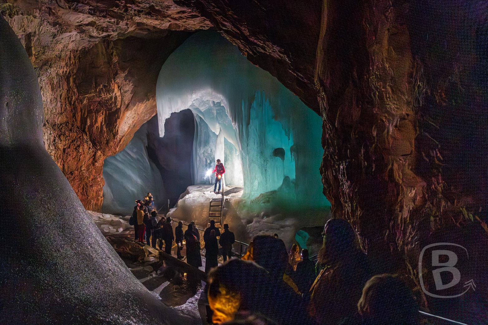 Die Eisschicht in der Höhle nimmt immer noch zu, so dass die Guides im Frühjahr immer wieder die Wege freipickeln müssen.