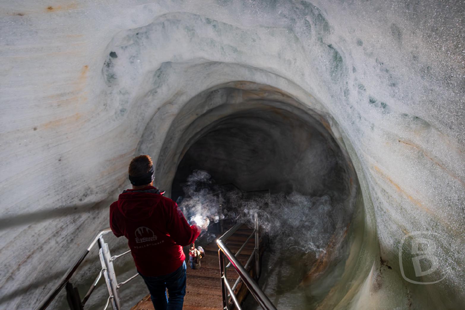 Gleich zu Beginn geht es dann auch schon mit der Treppe los. Der Guide macht immer wieder eine Pause und erklärt etwas zur Höhle oder den Eisformationen.