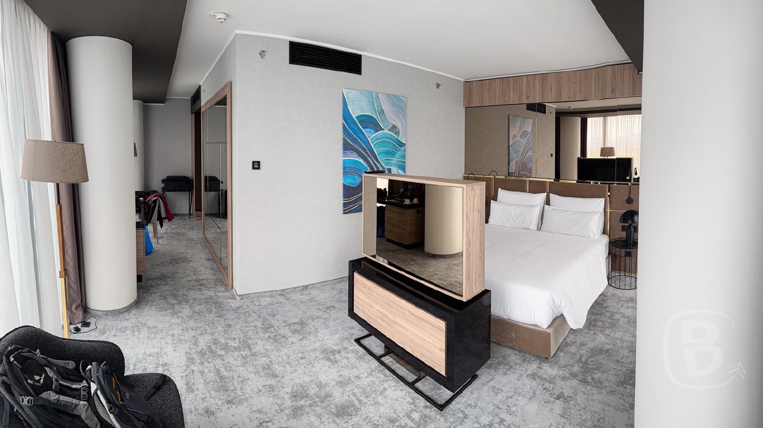 Im Grand Plaza Hotel angekommen gibt es wieder eine gute Nachricht: Wir haben erneut ein Zimmerupgrade bekommen. Diesmal bekommen wir ein Superior Deluxe Double Room mit ca. 45 m2. Das Upgrade vom Grand Double Room ist jetzt nicht so groß, wir haben aber ein Eckzimmer im 12. Stock, welches komplett verglast ist. Sehr schön. Butzele hat auch einen schönen Platz in der Tiefgarage.