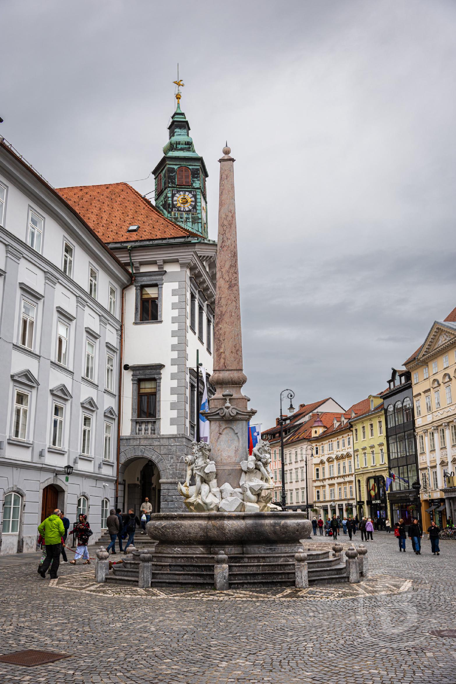 Der nächste Weg führt uns zum Rathaus und Robba-Brunnen. Der Brunnen der drei Flüsse des Landes Krain auf dem Stadtplatzes ist eines der bekanntesten Barockdenkmäler in Ljubljana. In den Jahren 1743-51 wurde er vom venezianischen Bildhauer und Architekten Francesco Robba erbaut. Das Rathaus wurde im späten 15. Jahrhundert erbaut.