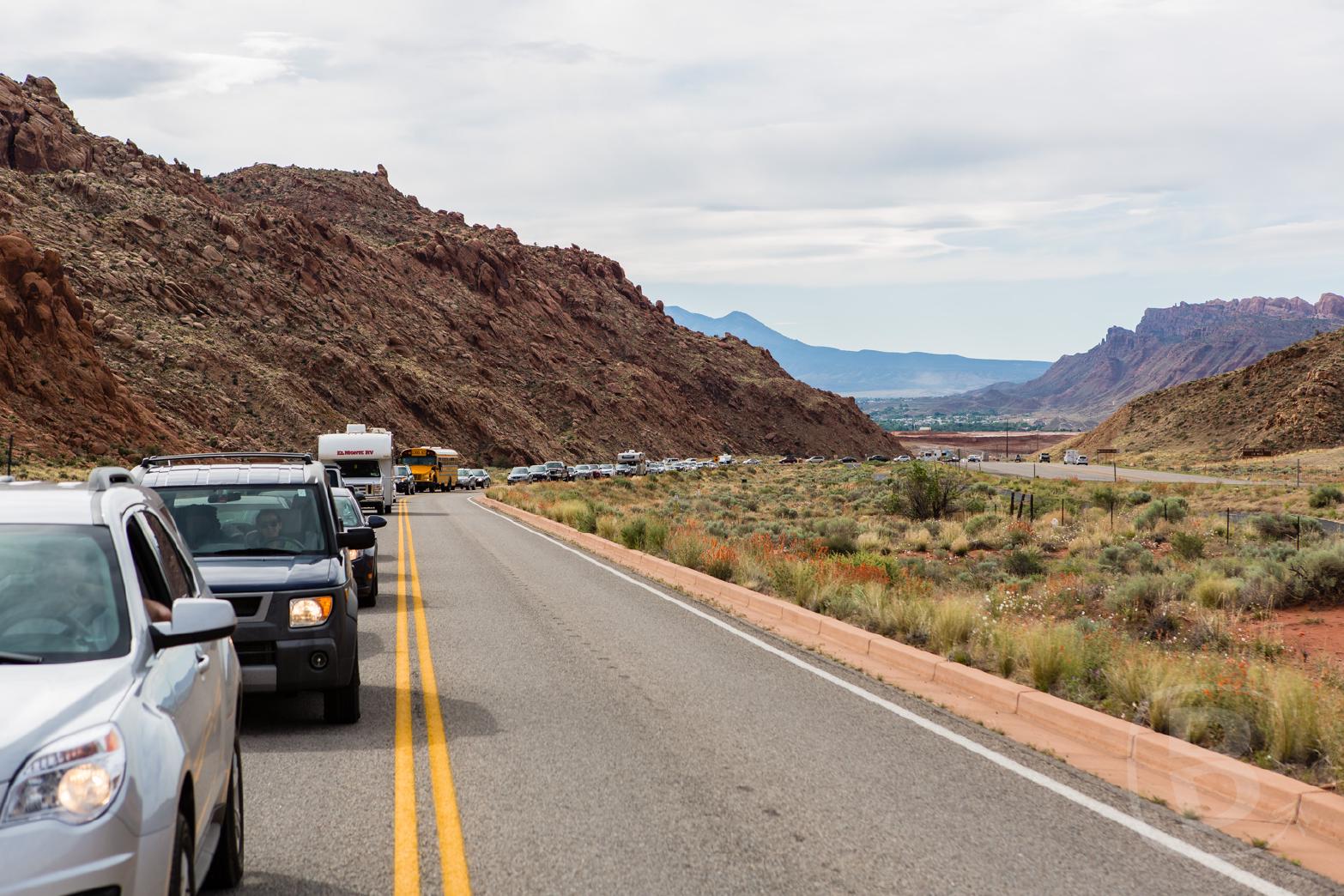Nach dem Frühstück fahren wir wie jeden Tag in den Supermarkt und kaufen für den heutigen Tag ein. Jeannette möchte gern noch eine Flasche Wein für heute Abend mitnehmen. Auf Nachfrage, wo der im Supermarkt zu finden ist, bekommt sie als Antwort nur ein sehr Entsetztes: No Wine! Stimmt ja, wir sind im mormonisch geprägten Utah, hier gibt es Wein nur in speziellen staatlich lizensierten Läden. Nebenbei nehmen wir jeder noch einen Kaffee im Starbucks mit. So gestärkt fahren wir in den Arches NP. Am Eingang der erste Schock. Eine riesige Autoschlange steht am Eingang und begehrt Einlass.