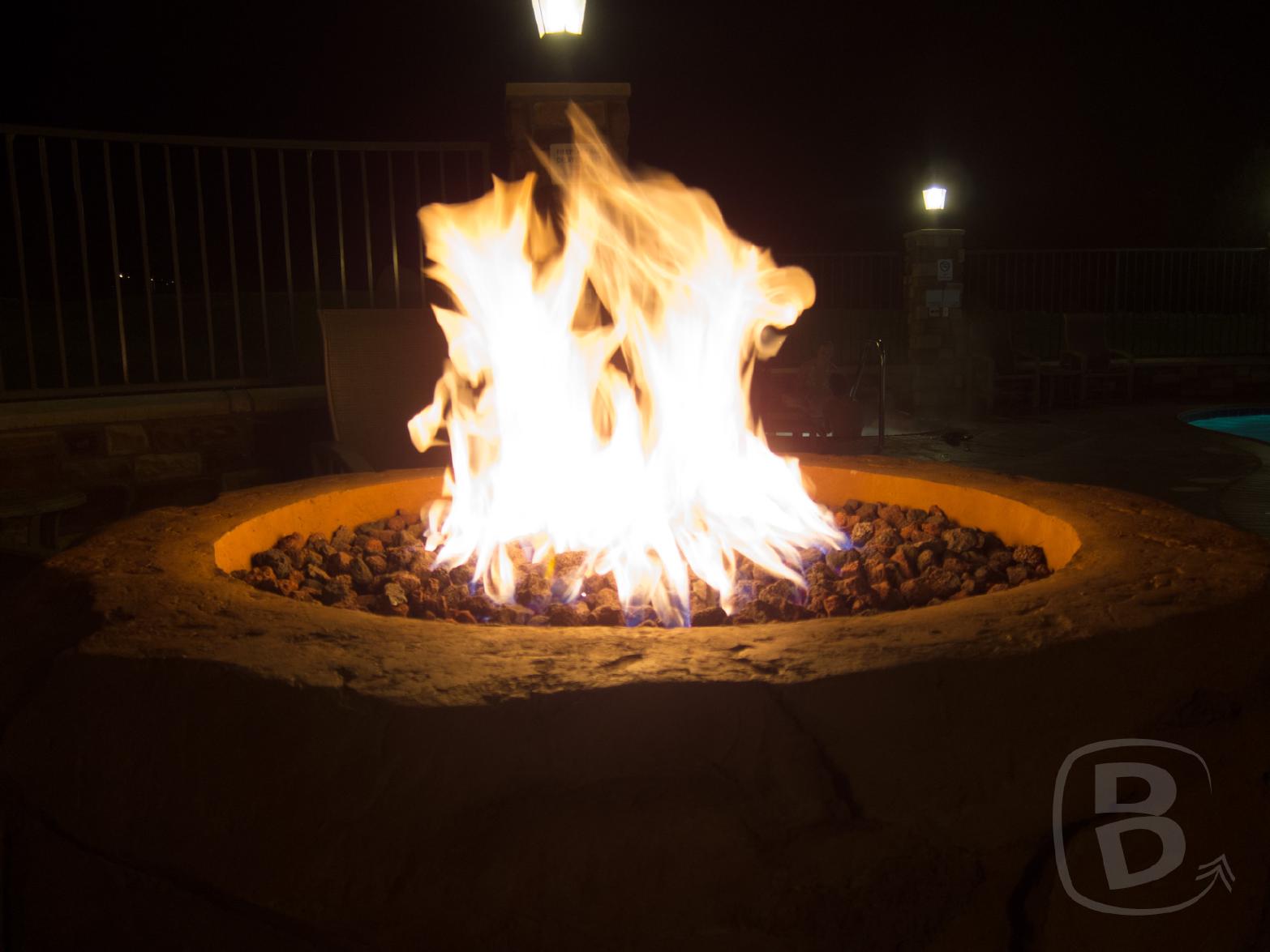 Wieder im Hotel beschließt Jeannette noch in den Pool zu gehen. Als sie wieder hoch kommt, berichtet sie, dass am Pool abends von 9-11 Uhr ein Lagerfeuer brennt. Also trinken wir unseren Wein dort, sehr romantisch.