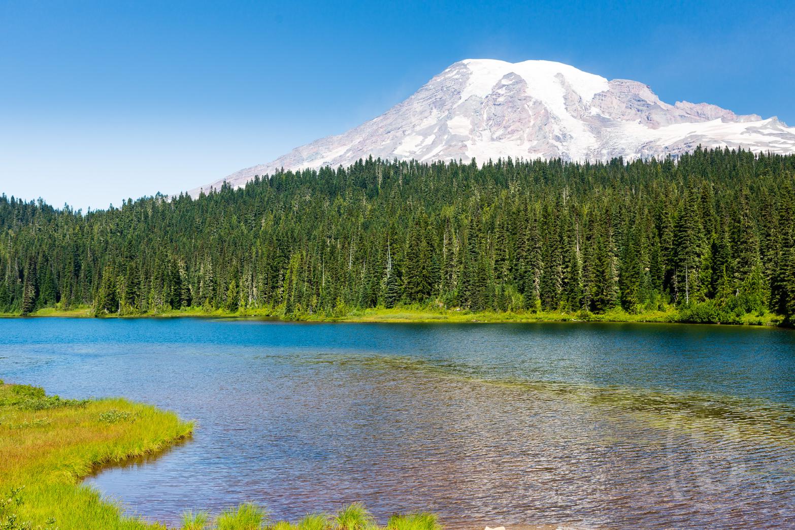 Der nächste Halt ist der Reflection Lake. Hier spiegelt sich bei Windstille der Mount Rainier im Wasser. Leider geht heute ein leichter Wind, so dass ich nur den Berg und den See, aber leider ohne Spiegelung, fotografieren kann. Alles Gute ist leider nie beieinander.