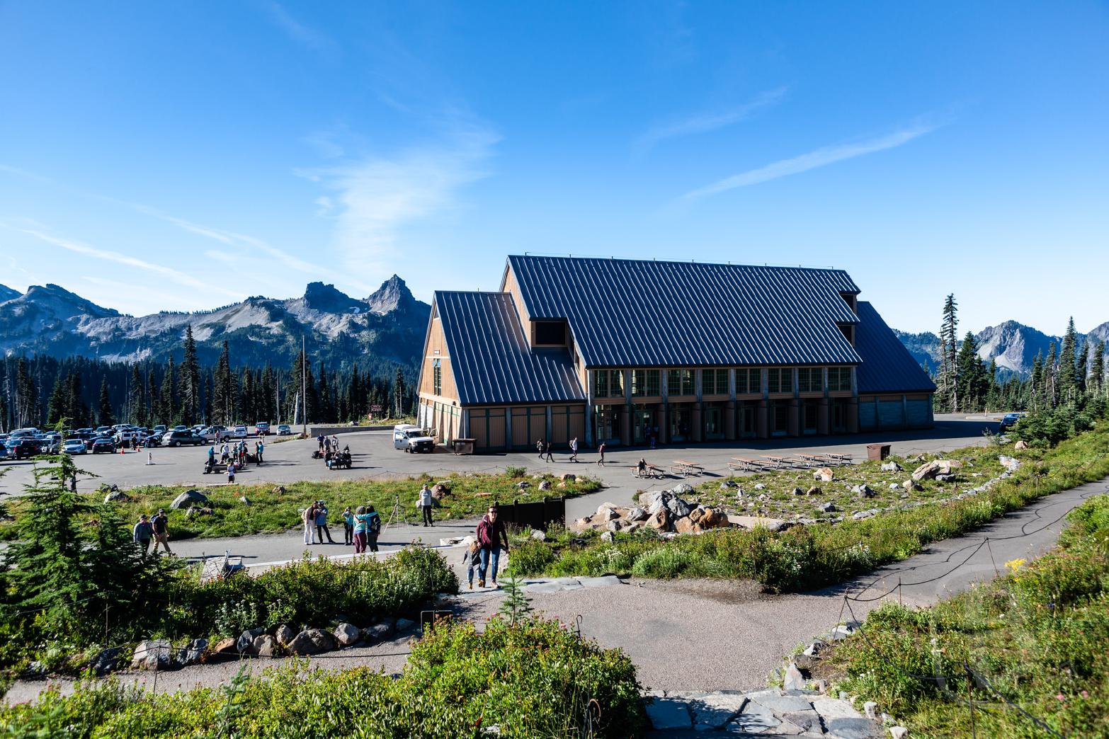 Nach dem Frühstück geht es direkt zum Mount Rainier NP. Am Parkeingang zeigen wir unseren Pass vor, bekommen einen Parkplan ausgehändigt und können dann weiterfahren. Wir fahren zum Henry Jackson Visitor Center, hier wollen wir zum Panorama Point laufen. Wir bekommen gerade noch einen Parkplatz. Trotz der frühen Zeit ist das Visitor Center schon sehr gut besucht.