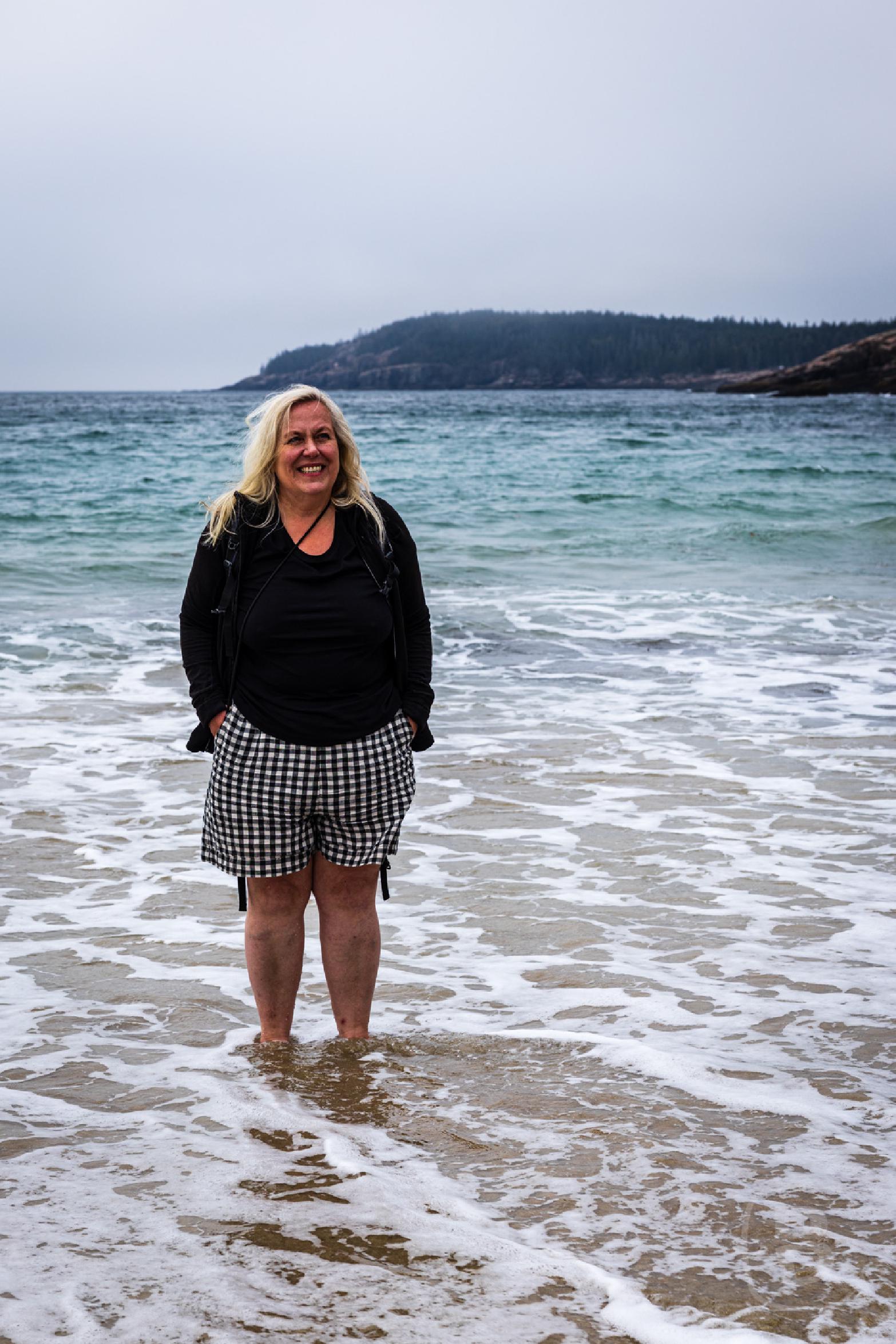 Der nächste Halt ist Sand Beach. Inzwischen ist es wirklich kalt geworden. Jeannette möchte aber unbedingt ihre Füße im Atlantik baden. Dem Gesichtsausdruck nach zu urteilen, scheint das Wasser nicht ganz warm zu sein.