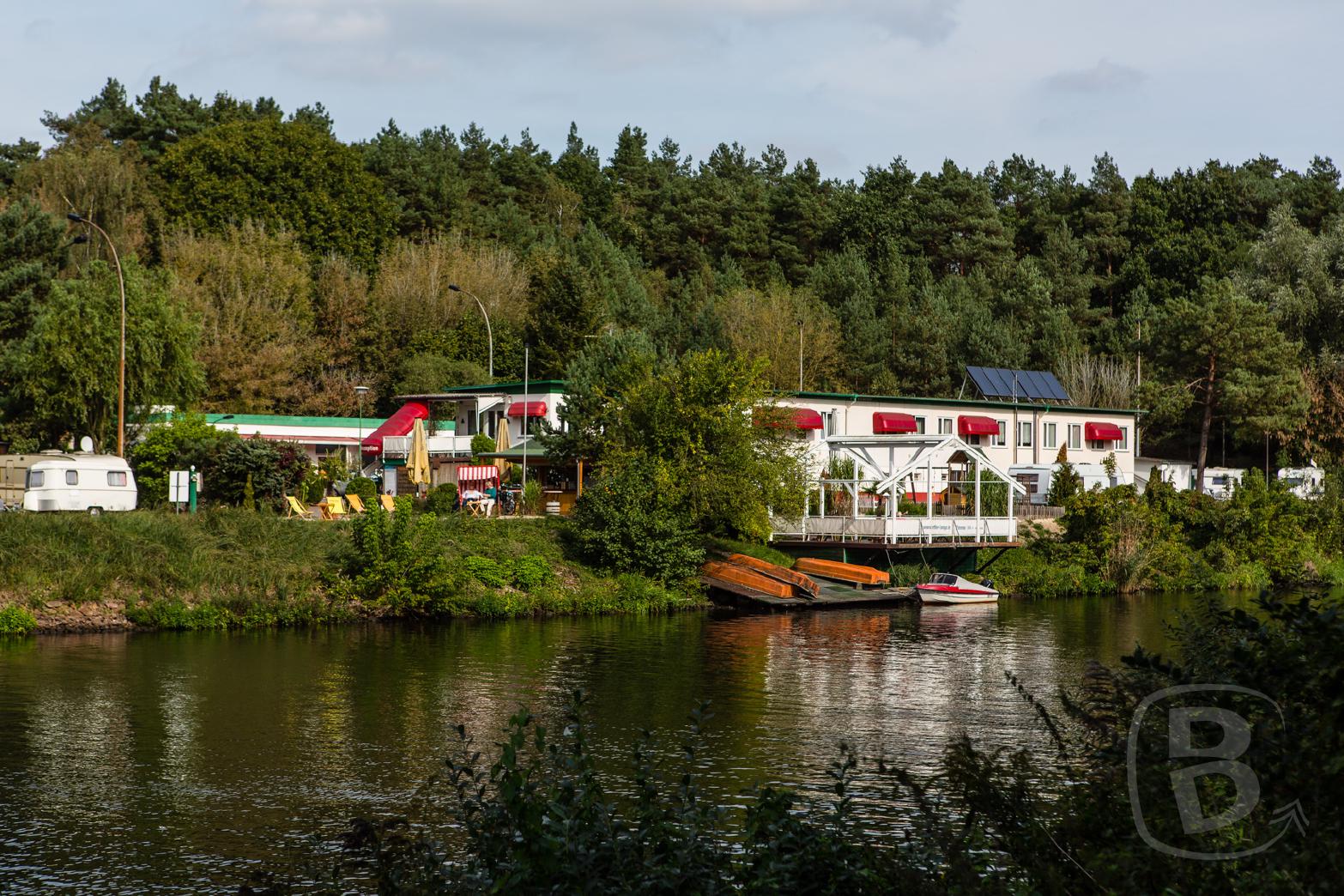 Also geht es am Teltowkanal entlang zum ehemaligen Wasserstraßengrenzübergang Dreilinden/Kleinmachnow. Hier ist jetzt ein Campingplatz untergebracht. Die Gebäude wurden aufgehübscht, sehen jetzt aber, bedingt durch die roten Markisen, aus wie ein Freudenhaus.