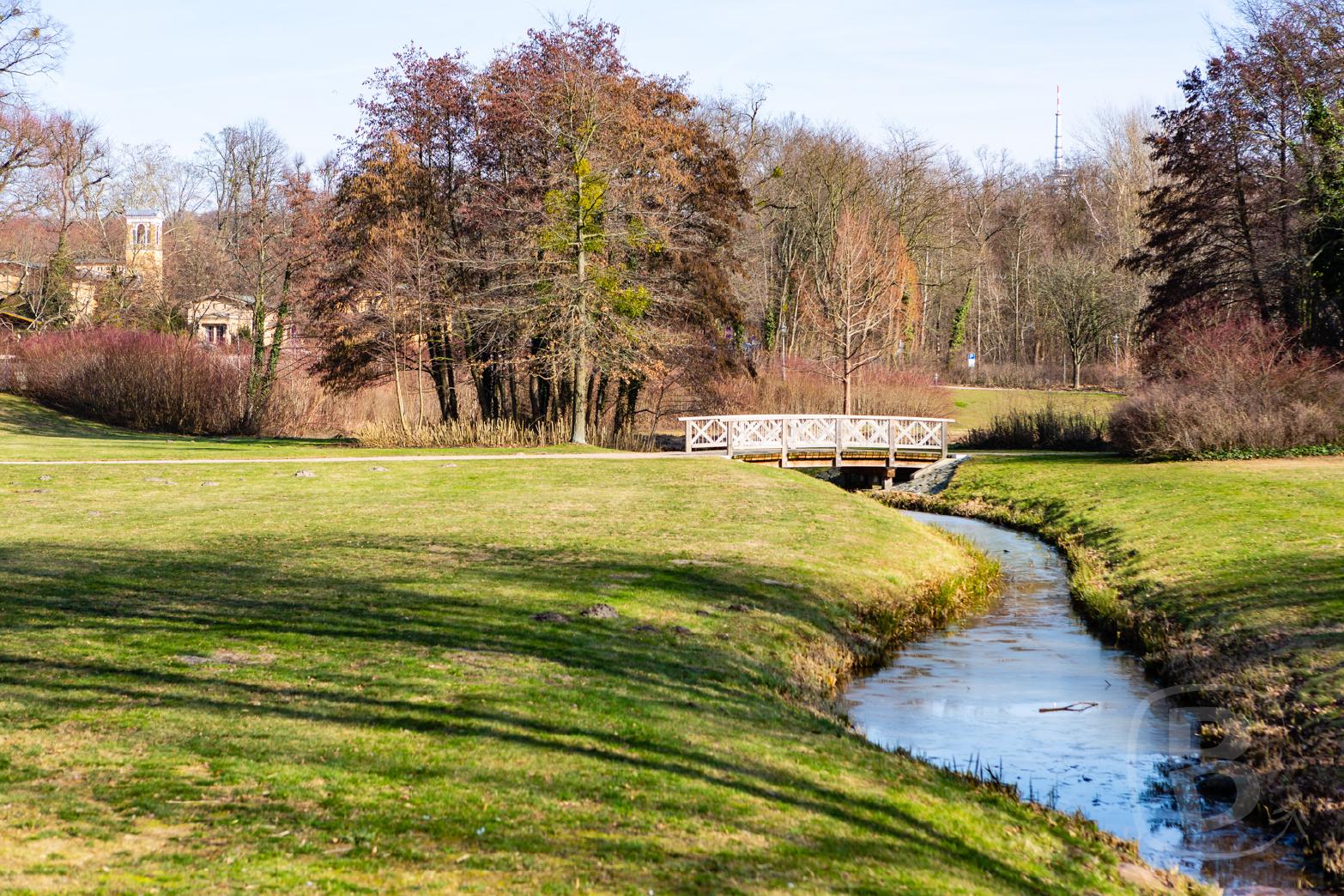 Nach der kurzen Überfahrt laufen wir an der Pfauenvoliere vorbei zum Jagdschirm. Hier befindet sich diese wunderbare Brücke, die über den Biberteich führt.