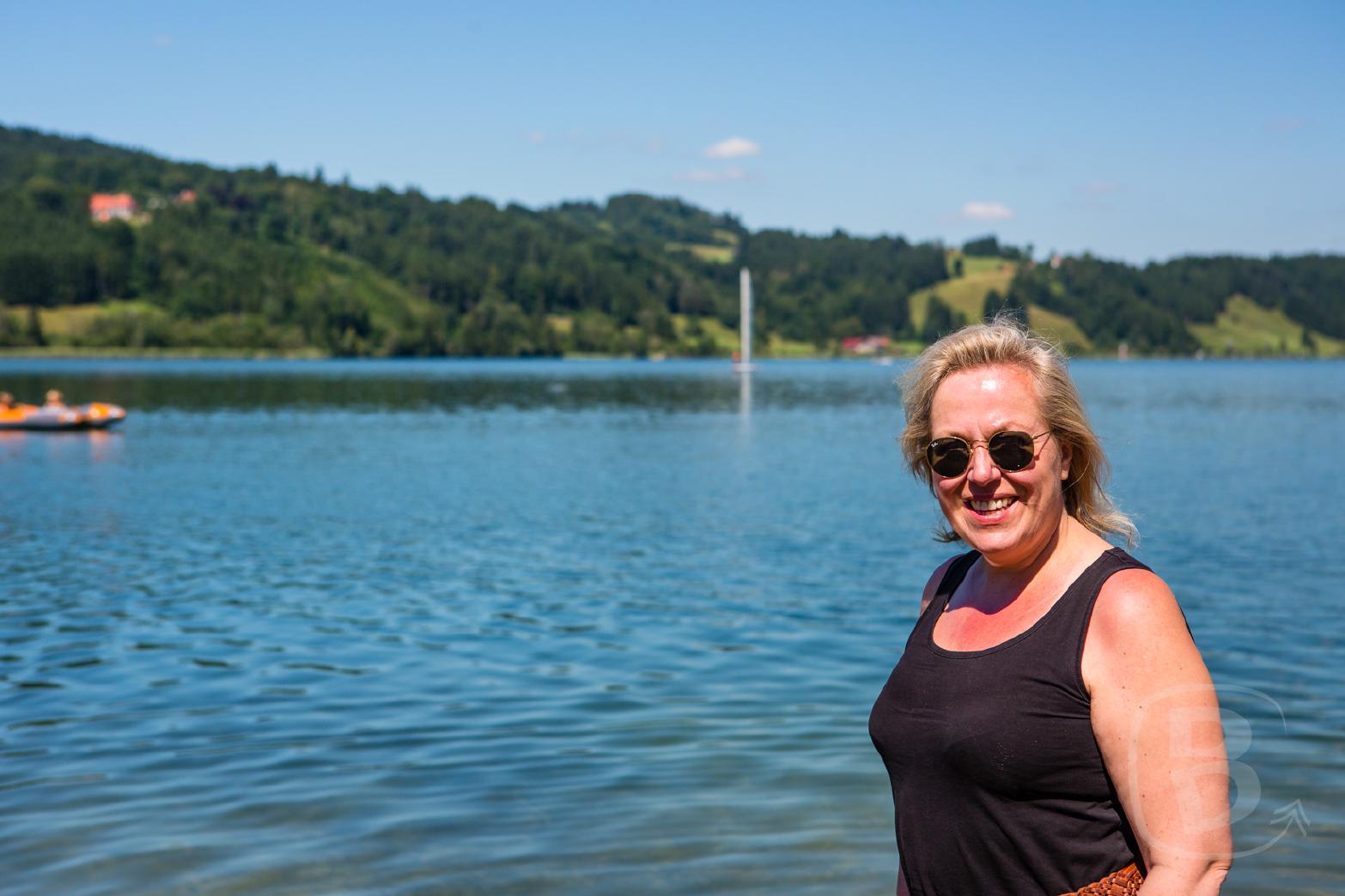 Am Großen Alpsee möchte Jeannette noch ihre Füße in das Wasser halten. Also schnell geparkt und gefühlt, wie kalt das Wasser ist. Es ist sehr kalt, zum Baden für uns nicht geeignet.