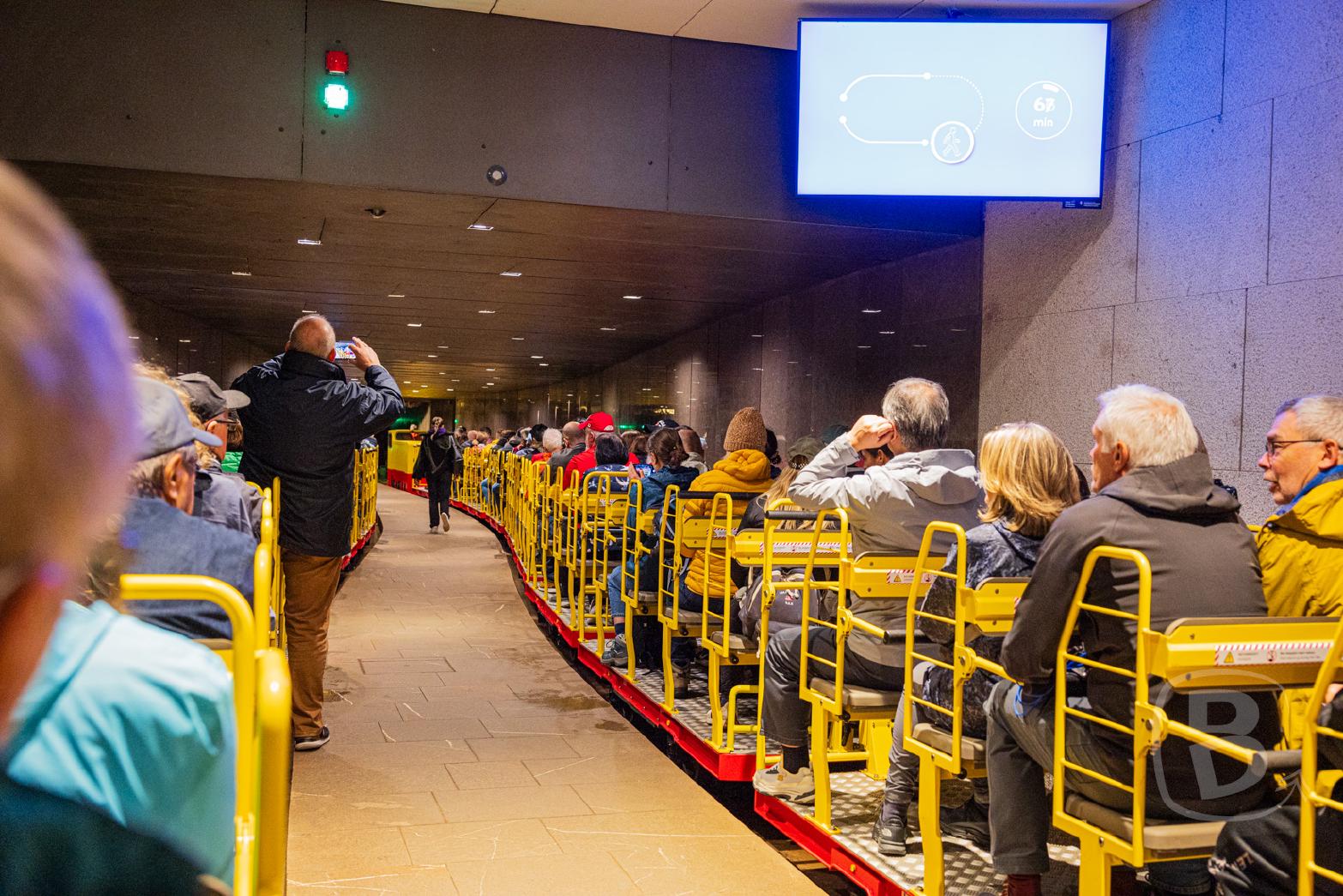 Um 10:00 Uhr kommt unsere Führerin und lotst uns zum richtigen Eingang. Wir laufen zwischen einer östereichischen und einer deutschen Busgruppe. Wir senken das Durchschnittsalter deutlich. Wir setzen uns in die Höhlenbahn.