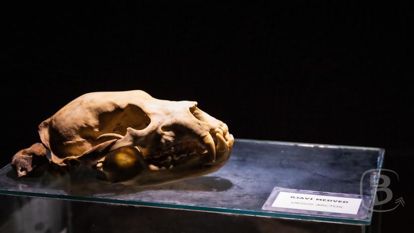 Dann steigen wir ab in die Höhle. Noch fällt ein bisschen Tageslicht hinein. Unser erster Halt ist an einem Schaukasten mit einem sehr großen Schädel, auf dem ein etwas kleinerer liegt. In der Höhle wurden viele Knochen des vegetarischen, ausgestorbenen Höhlenbären gefunden. Der große Schädel gehört zu ihm. Er hatte eine Schulterhöhe von zwei Metern, aufgerichtet vier. Der kleine Schädel auf der Vitrine gehört zu einem Europäischen Braunbären, der aufgerichtet zwei Meter groß ist.