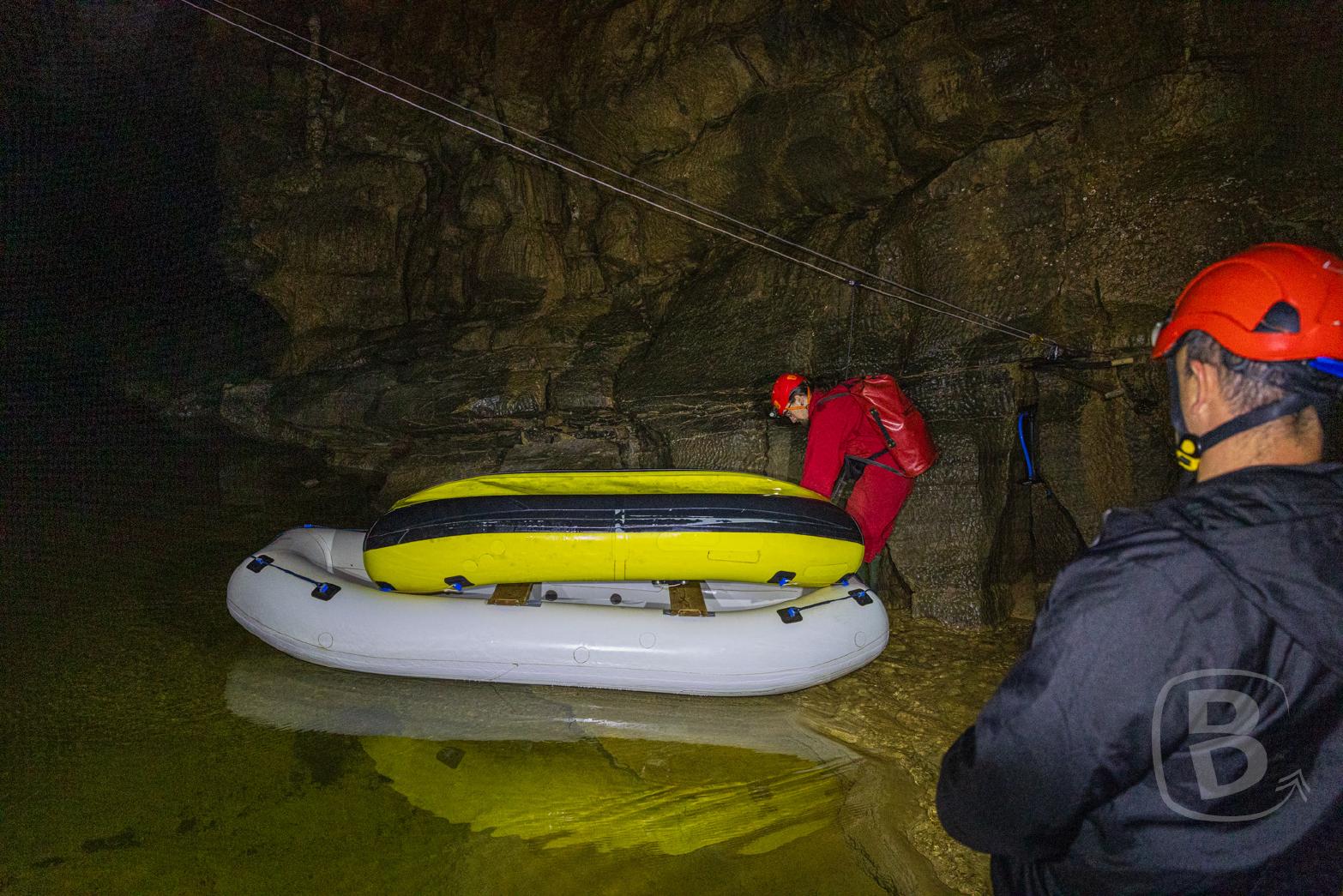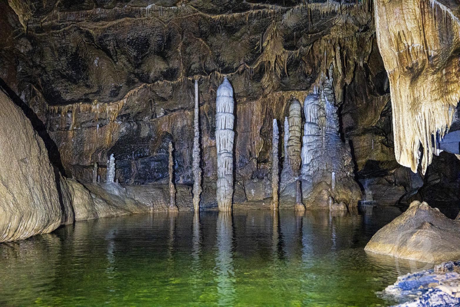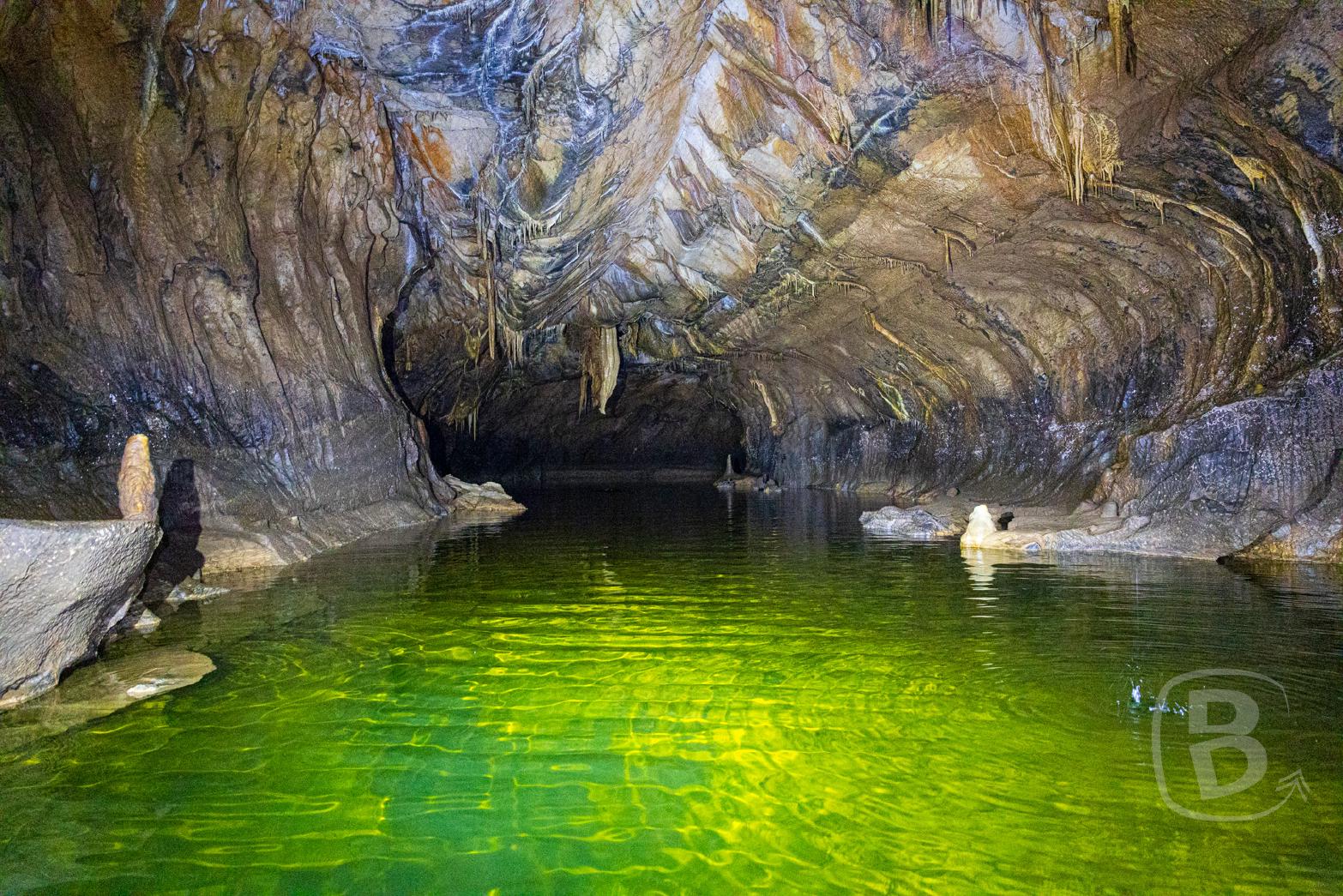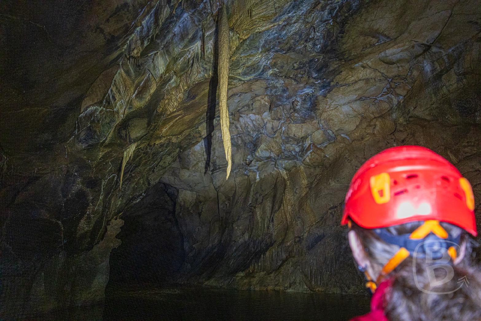 Dann kommt wieder eine Gehpassage, das einzige Licht sind jetzt noch unsere Stirnlampen. Die Durchfahrt am nächsten See ist so niedrig, dass sogar ich den Kopf einziehen muss. Es folgen wieder einige knifflige Gehpassagen, die sich mit weiteren Bootsfahrten abwechseln. Wir dringen immer weiter in die Höhle vor und sehen diverse tolle Tropfsteine. Luka erklärt und weist uns auf besondere Formationen hin, ist schon ziemlich toll. Langsam bin ich auch etwas ruhiger, scheint ziemlich sicher zu sein. An einer Stelle fordert uns der Guide auf, die Lampen auszuschalten. Es ist stockdunkel. Zwischen geschlossenen und geöffneten Augen ist kein Unterschied zu erkennen. Dazu ist es still, ganz gelegentlich ist ein Tropfen zu hören. Ziemlich unvergesslich.