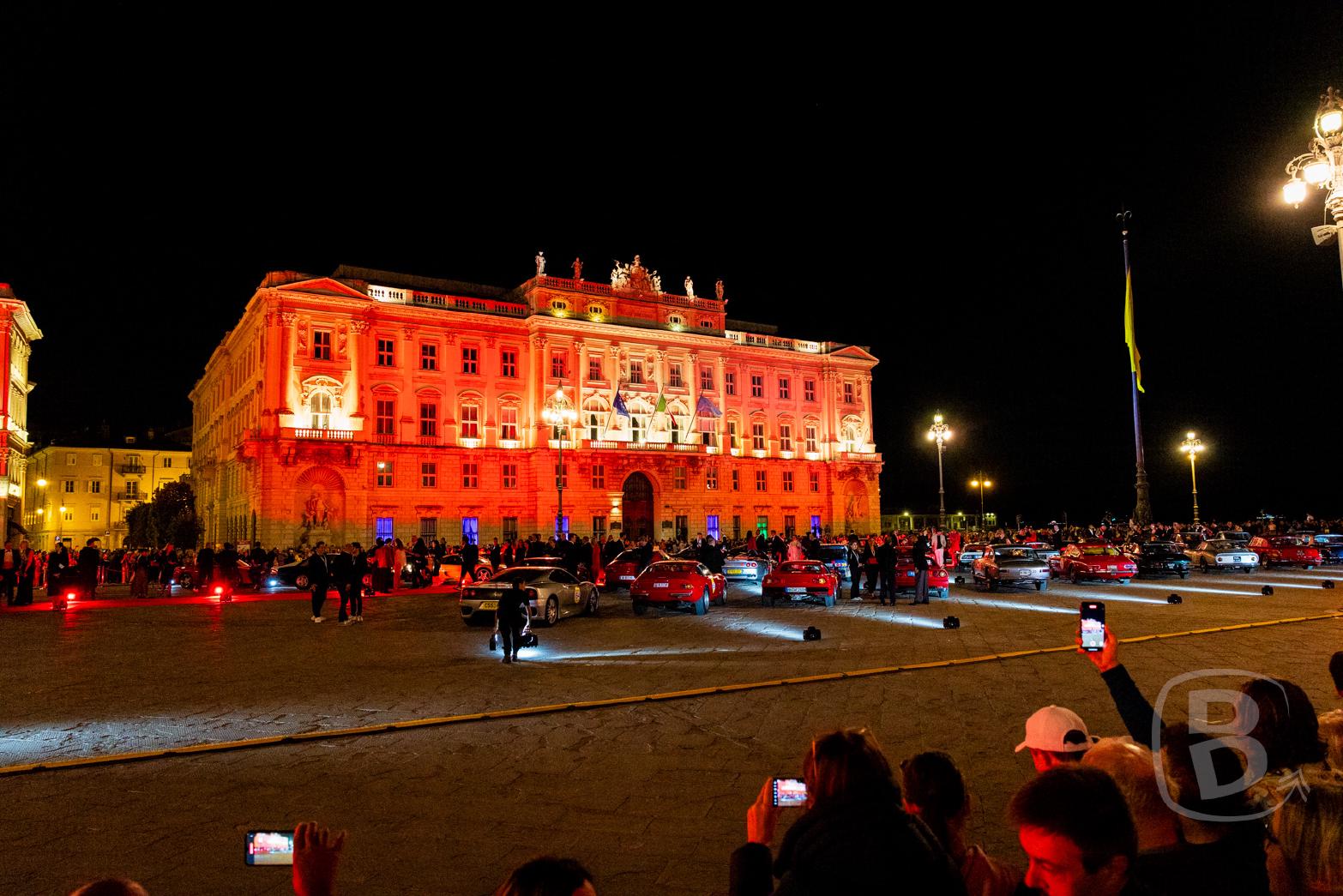 Auf dem Weg zum Hotel kommen alle Ferraris die Riva Nazario Sauro lang und fahren zum Piazza dell’Unità d’Italia. Hier scheint die Abschlußveranstalltung stattzufinden. Der Platz ist komplett in rotes Licht getaucht. Sieht ganz hübsch aus.