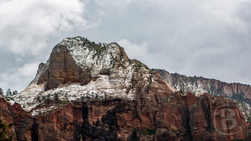 Den Abstieg machen wir über den Kayenta Trail, der uns direkt zur Shuttle-Bus-Haltestelle The Grotto führt. Von hier laufen wir am Bach bis zur Zion Lodge. Dort nehmen wir den nächsten Bus und fahren bis zum Court of the Patriarchs. Ich fotografiere noch schnell die Drei Patriarchen.
