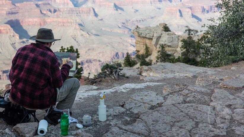 Wir beschließen das obligatorische Picknick am Mathers Point direkt im Grand Canyon National Park einzunehmen und dort gleich auf den Sonnenuntergang zu warten. Tatsächlich ist auch ein schöner Platz frei, wir müssen nur erst ein aufdringliches Eichhörnchen verscheuchen.