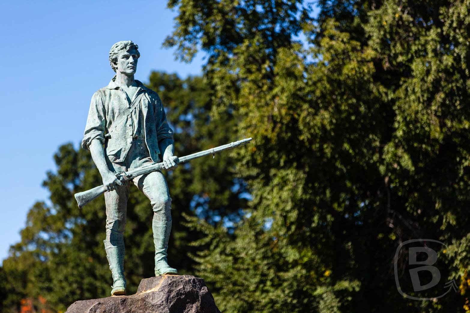 Auf dieser Seite der Brücke steht die Minutemen Statue. Sie zeigt Captain Isaac Davis, der zusammen mit Abner Hosmer bei dem Gefecht getötet wurde.