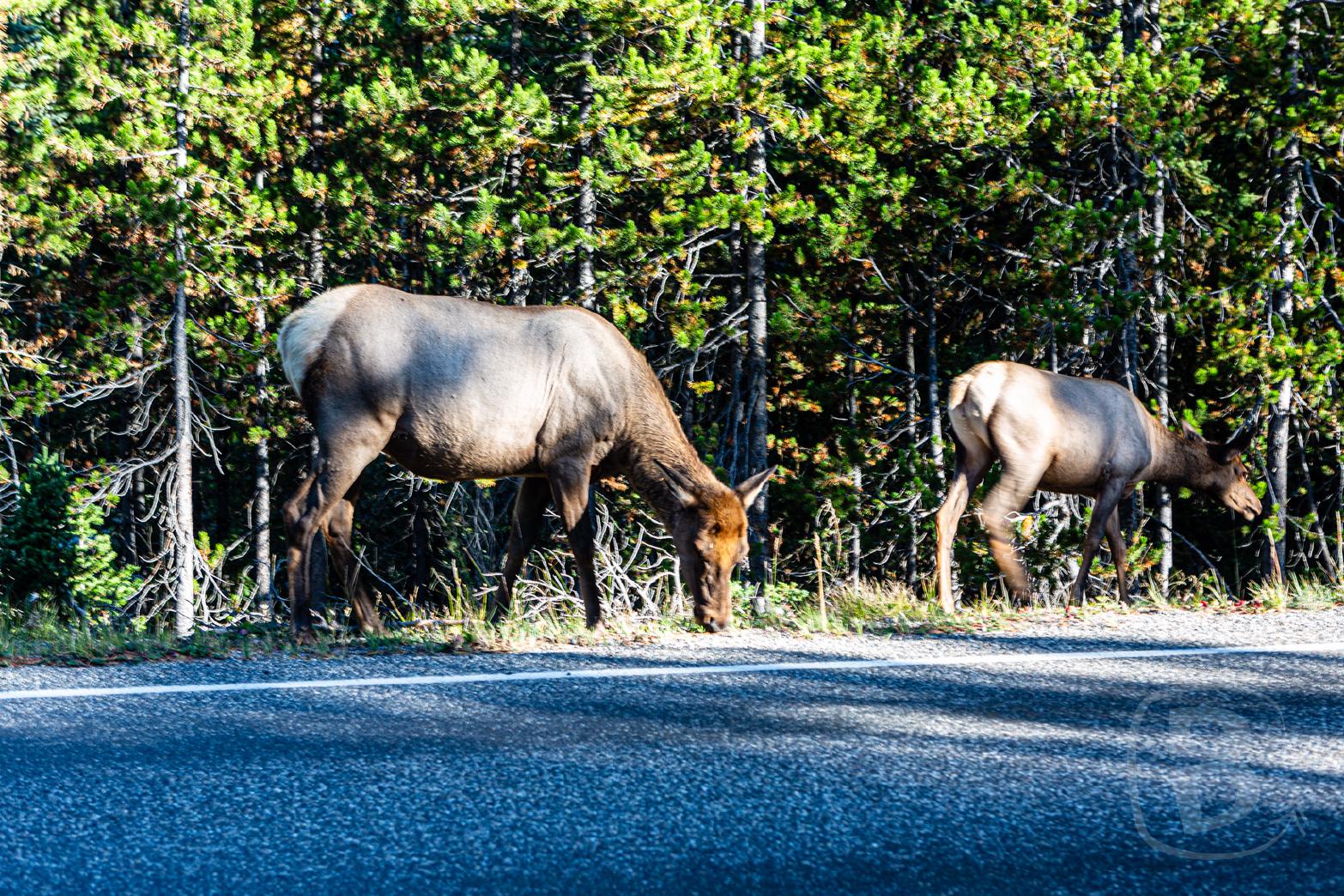 Wir fahren Richtung Canyon Village. Wir sind gerade auf den Highway eingebogen, da steht auch schon eine Moose Kuh mit ihrem Kalb am Straßenrand. Zu früher Stunde gibt es hier sehr viel Wildlife.