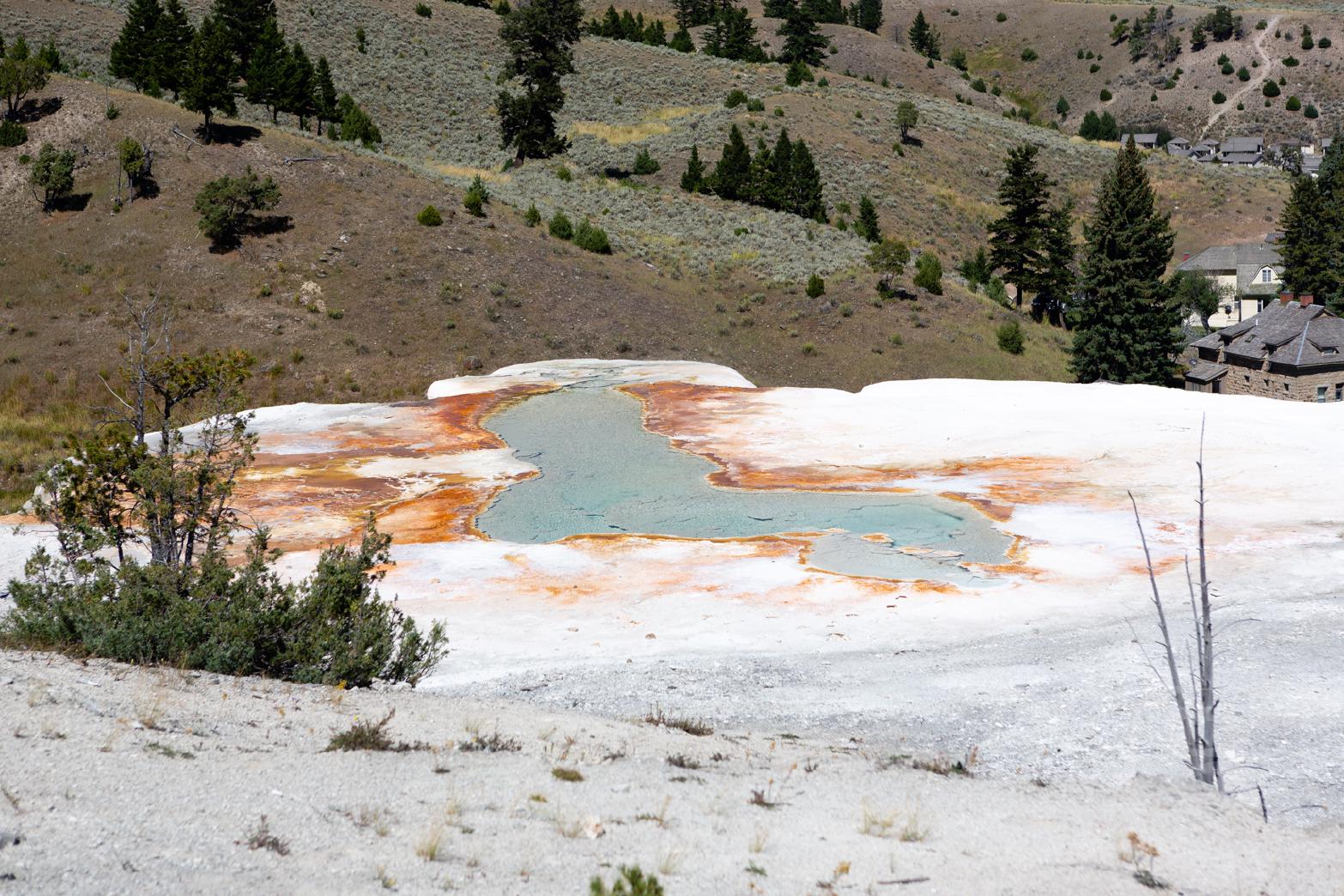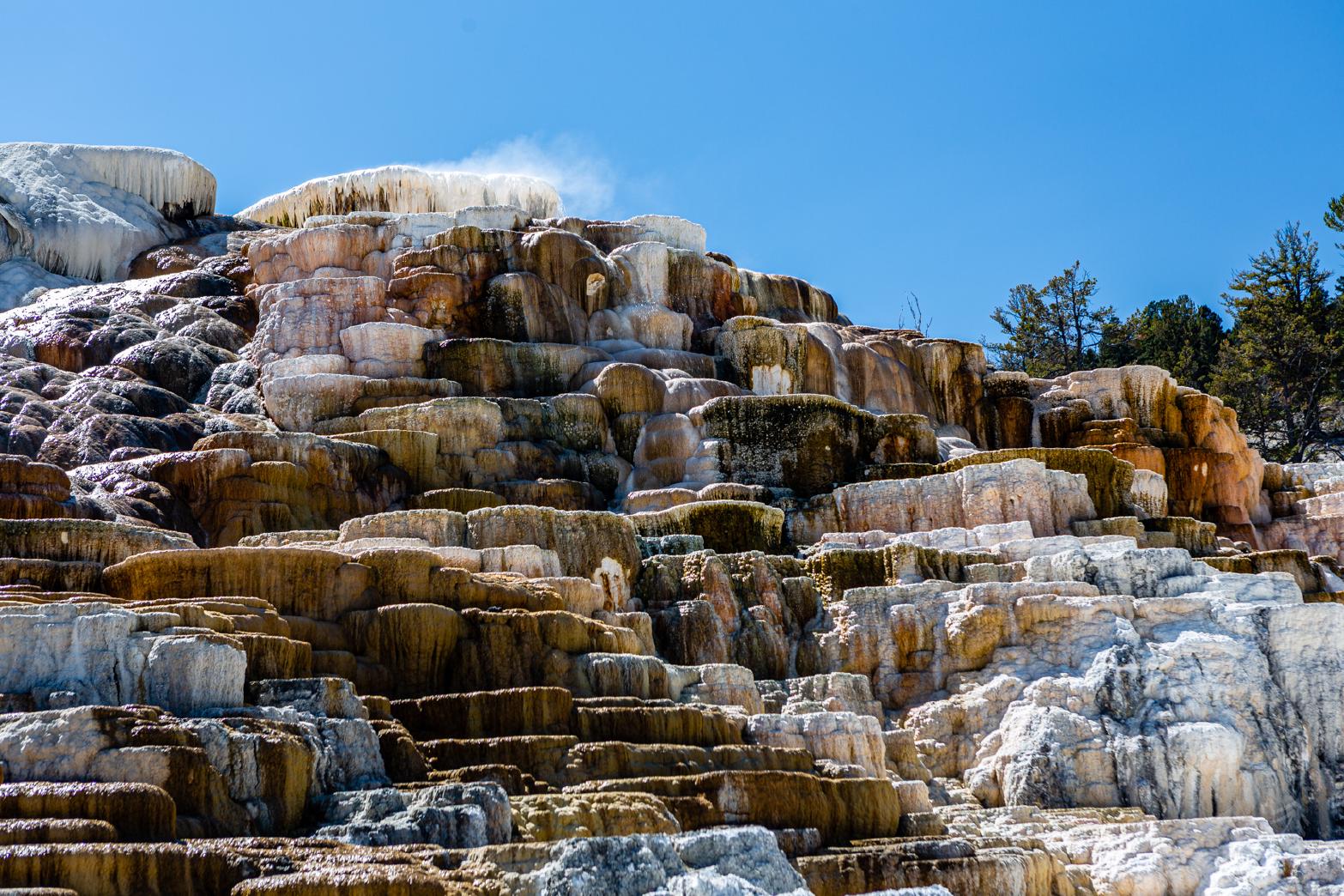 Nach unserem Essen gehen wir also zu der Hauptattraktion, der Lower Terraces Area. Direkt an der Straße steht der Liberty Cap. Dieser ist 11 Meter hoch und wurde von einer heißen Quelle erschaffen. Dieses dauerte mehrere 100 Jahre. Wann die Quelle versiegt ist, ist nicht bekannt.