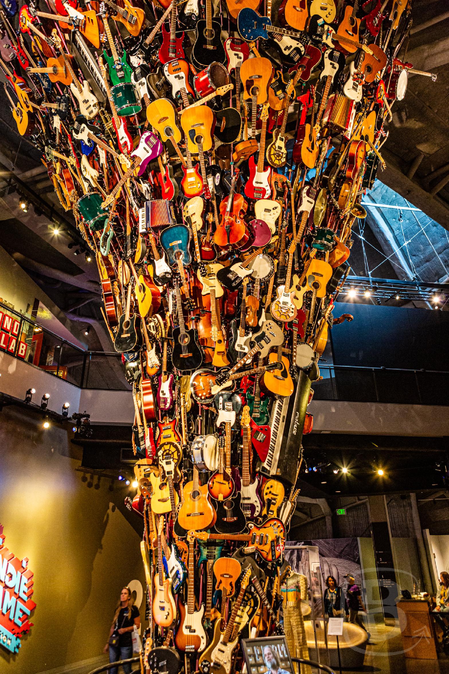 Weiter geht es zur Guitar Gallery. Hier sind ca. 20 Gitarren von berühmten Musikern ausgestellt. Im Eingangsbereich befindet sich ein Kunstwerk aus Gitarren.
