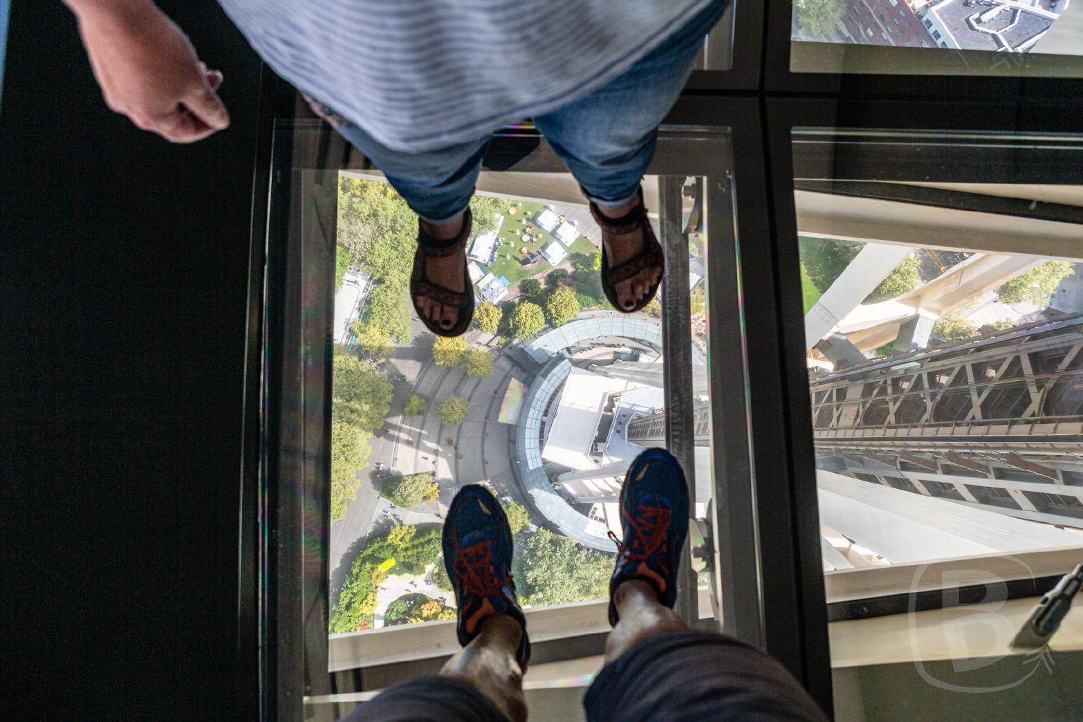 Von hier oben haben wir einen wunderbaren Blick auf Seattle. Es gibt zwei Bereiche: Einmal den normalen Ausblick und eine Etage tiefer die Glasböden, wo der Blick direkt in die Tiefe geht.