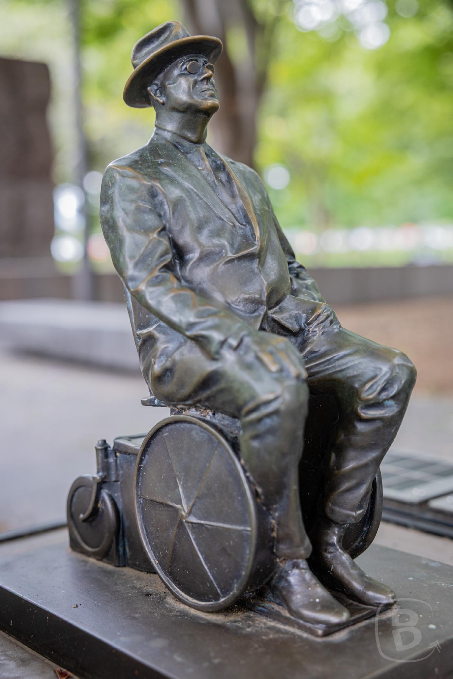 Von hier geht es weiter zum Franklin Delano Roosevelt Memorial. Es beginnt mit der Eleanor Roosevelt Statue und endet mit dem FDR Memorial Bookstore. Das ganze Areal ist ziemlich groß. Kurz vor dem Buchshop sitzt eine Rangerin und übt Banjo spielen.