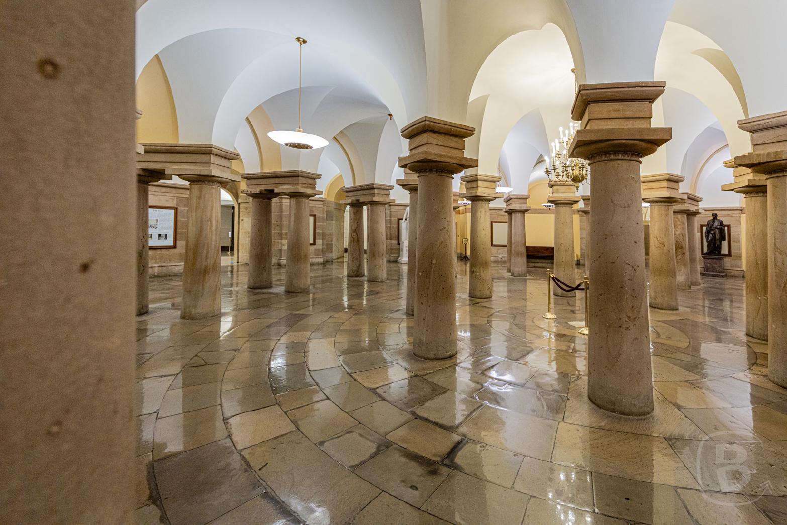 Nach dem Sitzungssaal geht es zur Krypta, deren 40 Säulen als Stützen für die Kuppel unmittelbar darüber dienen. in der Mitte ist ein Stern eingelassen, der den Mittelpunkt von Washington DC symbolisiert. Ursprünglich sollte hier Georg Washington begraben werden, der jedoch auf dem Mount Vernon beigesetzt wurde.