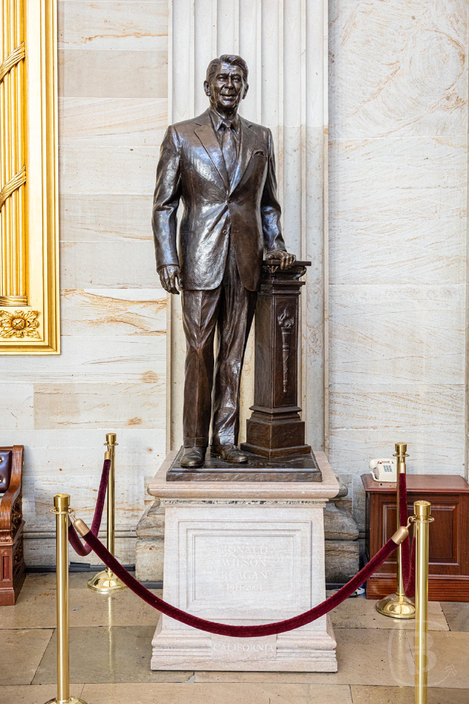 Anschließend geht es in die wirklich beeindruckende Rotunde. Auf der Hälfte ist ein Fries der amerikanischen Geschichte angebracht.Es ist allerdings nicht als Flachrelief in Stein gemeißelt, sondern gemalt. Es beginnt mit der Entdeckung Amerikas durch Columbus und endet mit der Geburtsstunde der Luftfahrt. Unten sind diverse sehr großformatige Gemälde und diverse Denkmale ausgestellt, unter anderem von Dr. Martin Luther King jr. und Ronald Reagan, in dessen Sockel der Statuette Teile der Berliner Mauer eingearbeitet sind.